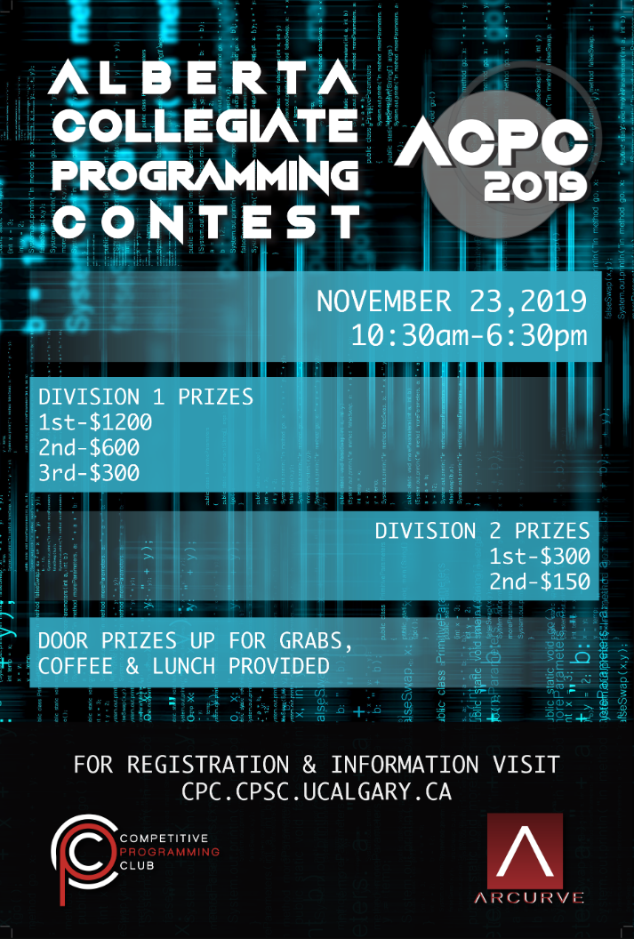 Competitive Programming Club (CPC) with the help of Arcuve as official sponsor, is once again hosting the Alberta Collegiate Programming Contest (ACPC). We hope you can join us this November 23rd from 10:00AM to 5:30PM. We will be serving coffee and lunch, and a talk by Arcurve. We have two divisions, so we strongly encourage first year students to test their skills in the contest.